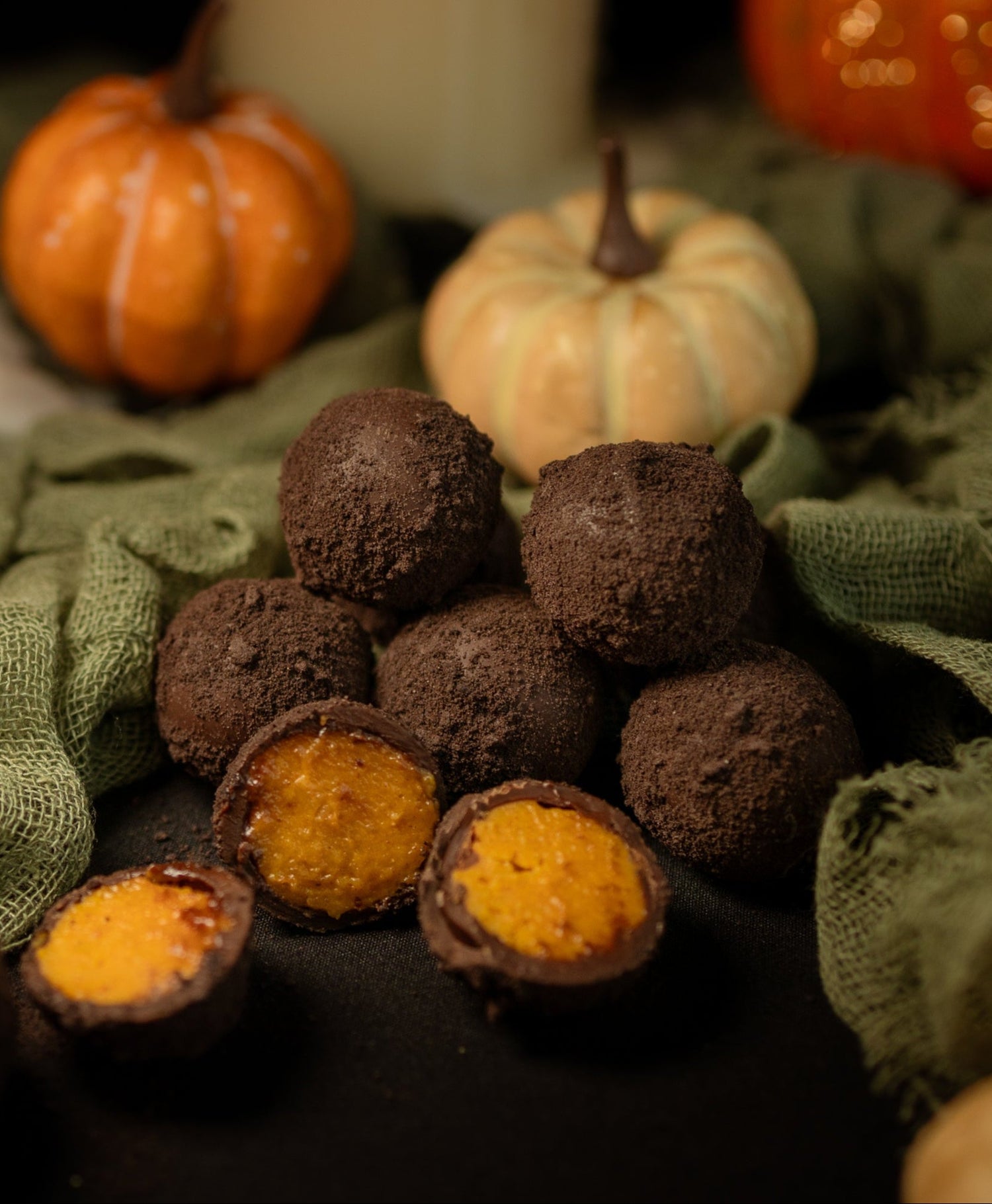 Immerse yourself in the warm, inviting essence of autumn with our Pumpkin Spice Truffle. This artisanal masterpiece blends the creamy richness of Dutch Gouda and velvety pumpkin purée with the enchanting warmth of anise, cardamom, and a hint of cinnamon. Encased in a delicate shell of Belgian dark and white chocolate, it’s a symphony of flavors that perfectly captures the spirit of the season.
