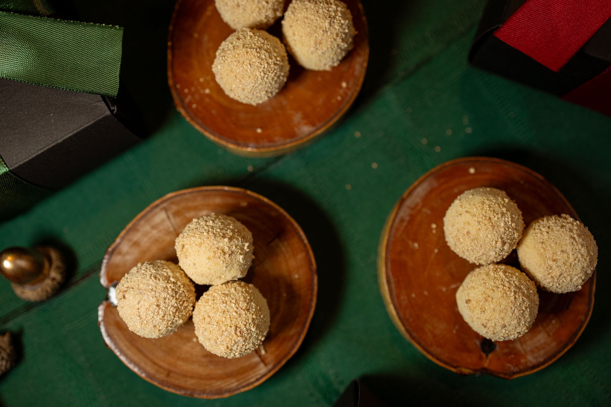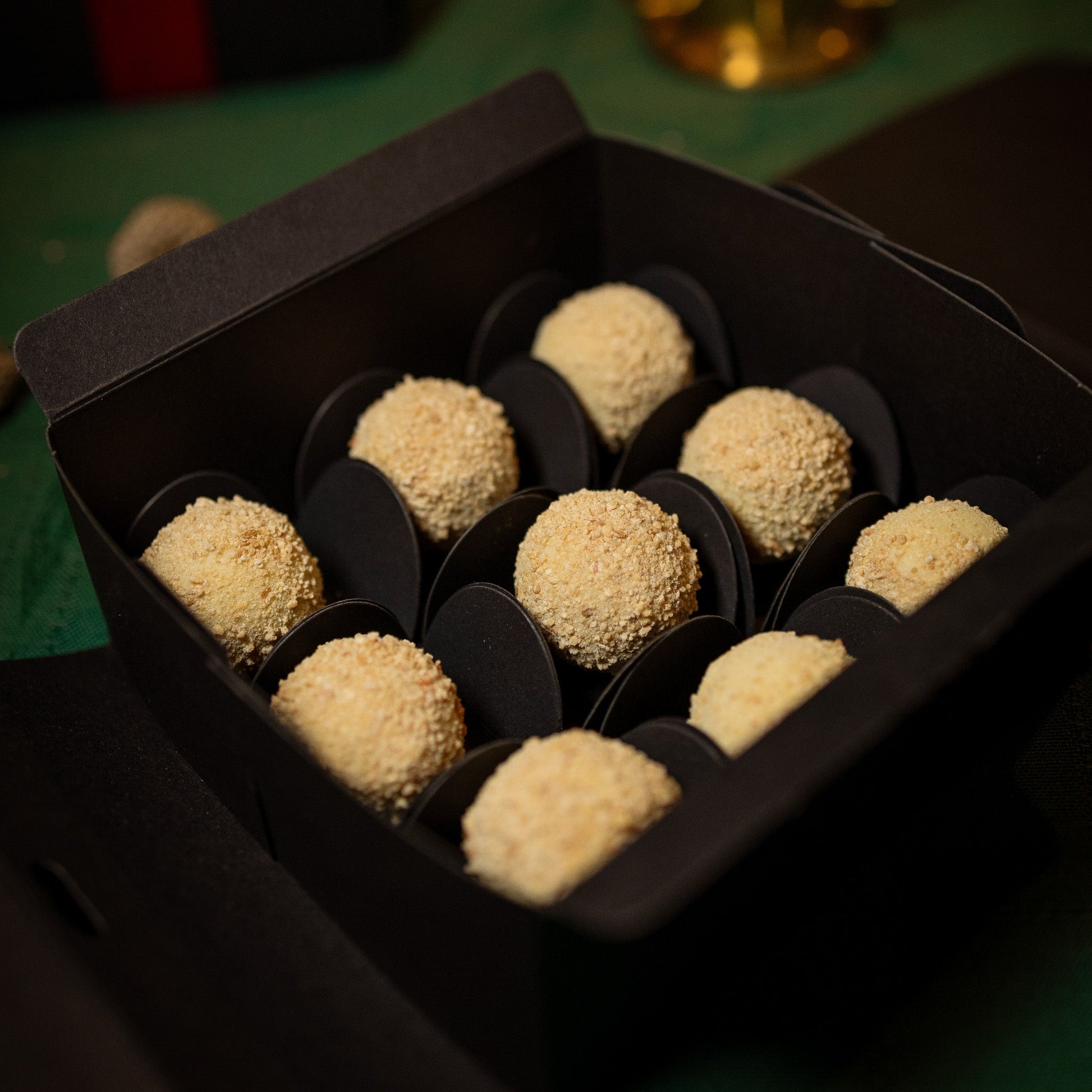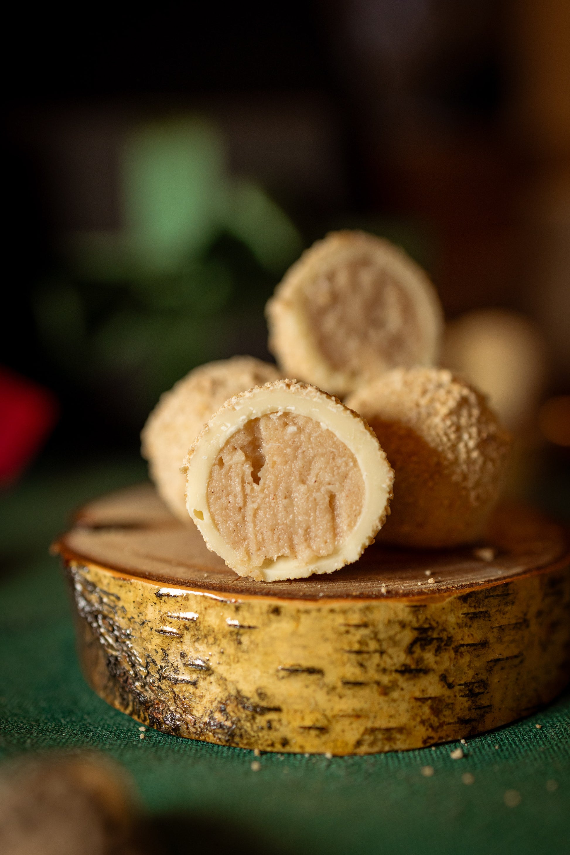 Festive and cozy, this truffle captures the spirit of Christmas in every bite. Crafted from creamy Belgian white chocolate and blended with smooth Cheddar cheese and sweet apple purée, it is gently spiced with cinnamon and a hint of whiskey for a warm holiday touch. Rolled in a fine crumble of buttery cookies, it adds a delicate crunch that makes each bite irresistible.